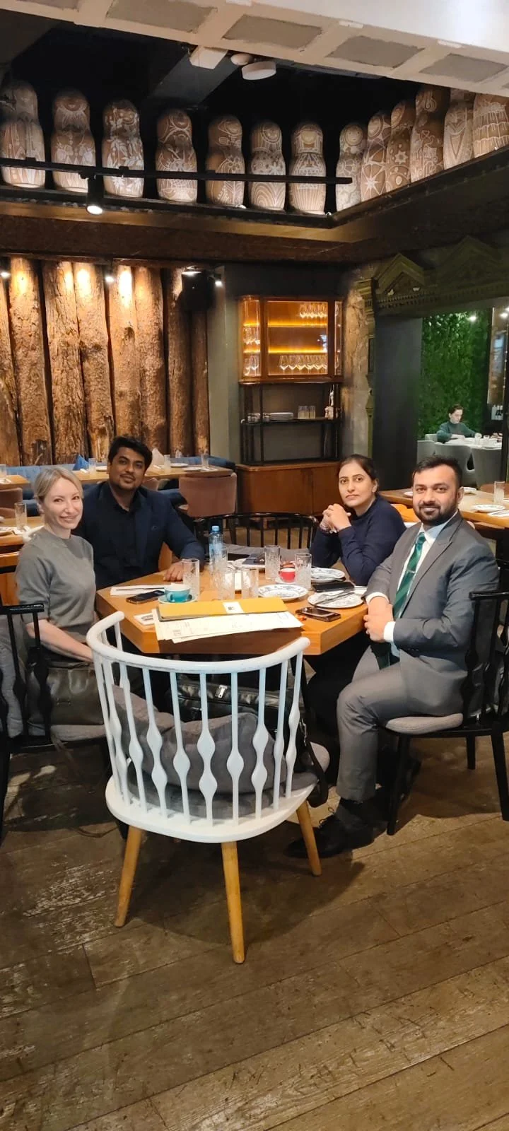 Four people sitting at a restaurant table with glasses and menus, with wooden wall decor and shelves with art pieces in the background.