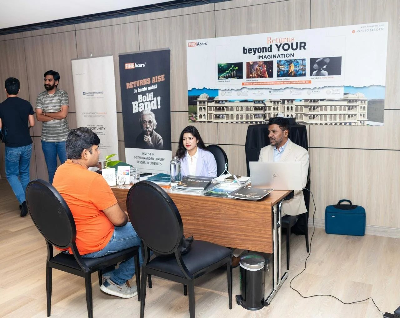 A business meeting in an office, with three people sitting at a wooden table and two standing in the background, with banners and a large advertisement screen on the wall.